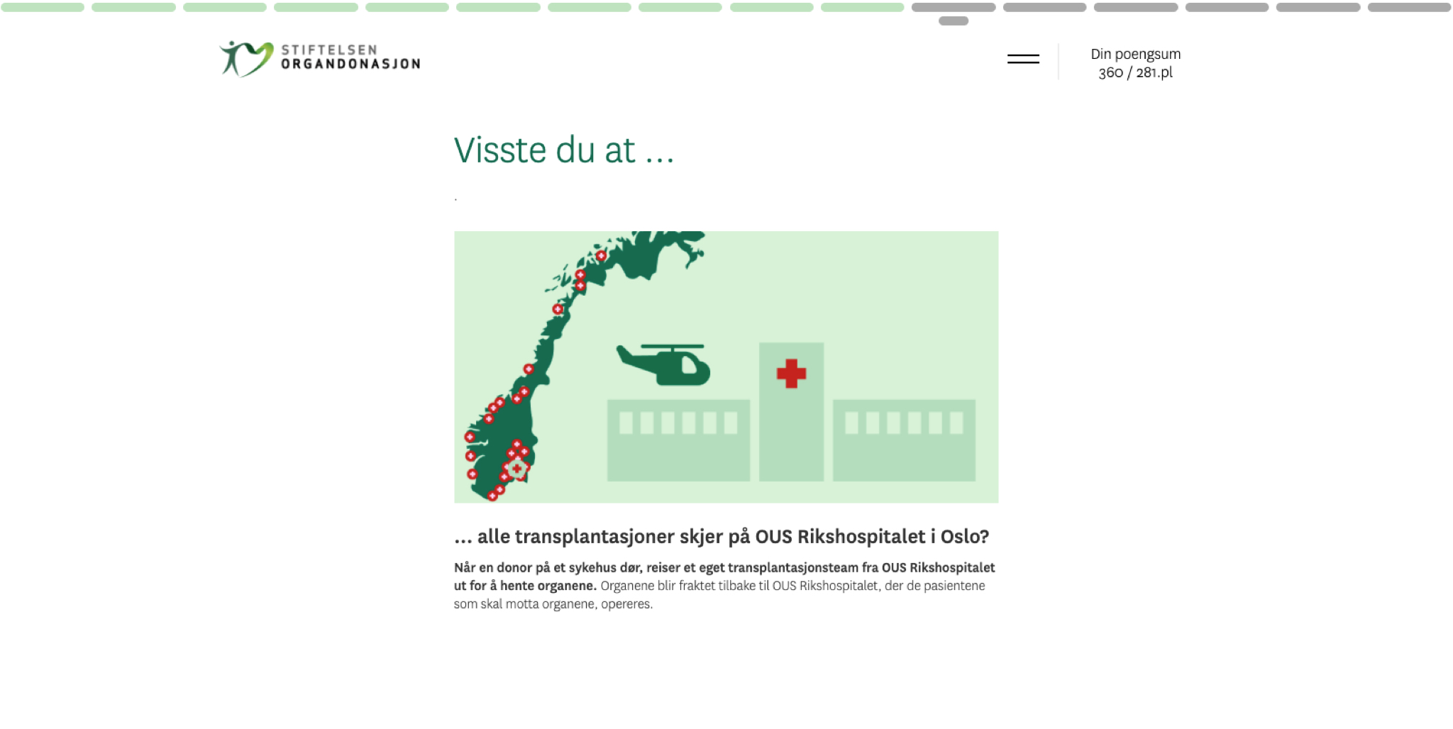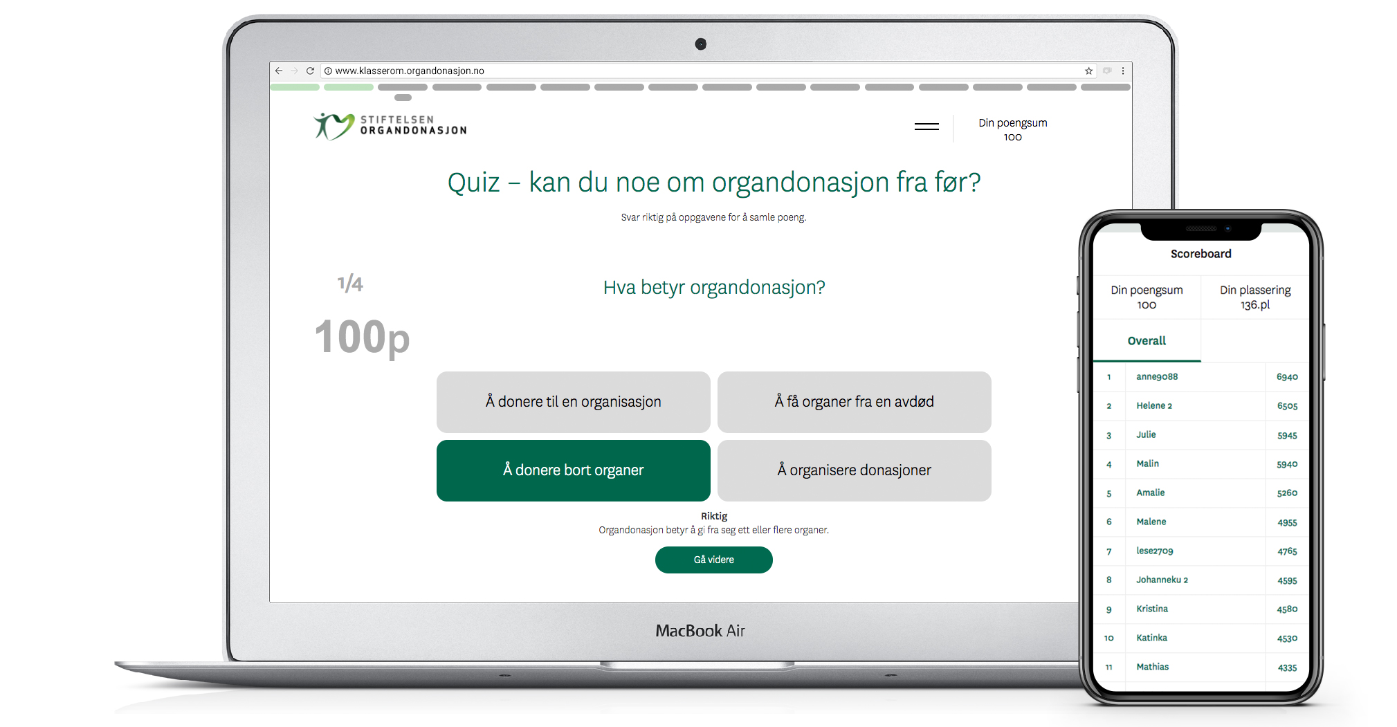 Stiftelsen organdonasjon har frivillige undervisere som besøker skoler over hele landet. For dem var det viktig å utvikle en e-læring som kunne benyttes i denne type undervisning, men som det også var mulig for lærere og elever å bruke på egenhånd. For å gjøre det litt gøyalt er den laget nærmest som et spill. Man kan spille alene eller som del av en klasse, samle poeng og til slutt gå opp til en eksamen. Deretter kan man sammenligne poengscoren sin med andre – og dele resultatene på facebook.