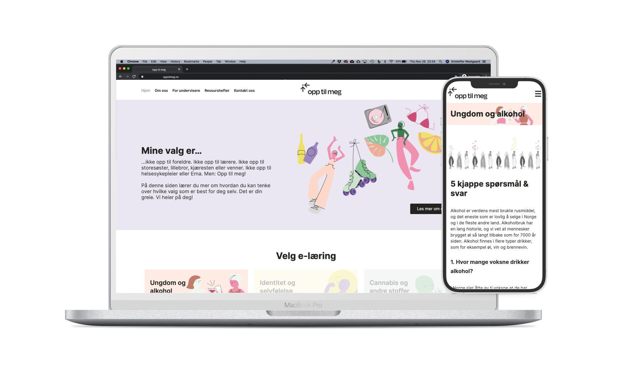 Ungdomsorganisasjonen Juvente har fornyet undervisningsopplegget sitt om rus og livsmestring. E-læringen «Opp til meg» er ment å få ungdom til å reflektere over viktige livsvalg og i denne løsningen finnes det derfor ingen rett eller gale svar. Etter å ha registrert seg anonymt får man servert utsagn man må si seg enig eller uenig i, og påstander man ta stilling til. Basert på hvilket svar man gir, får man presentert en passende fakta-tekst. E-læringen er enkel og elegant, med pene illustrasjoner og enkelt design.